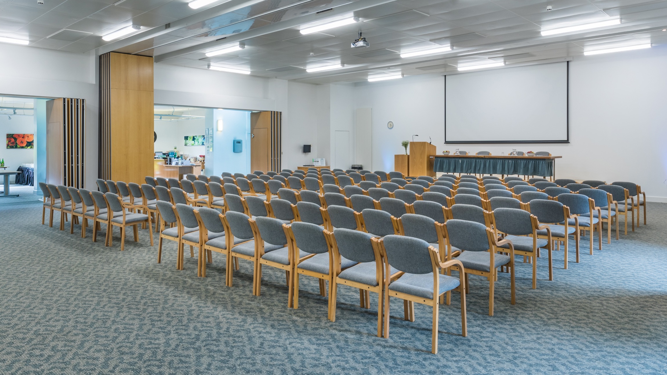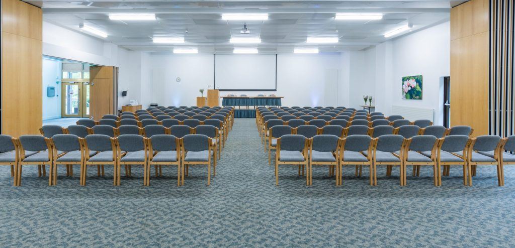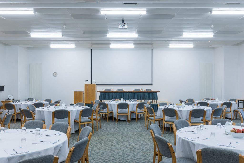 The largest area with a large stage, with lectern and stage lighting, it is perfect for exhibitions, large presentations or AGMs. It can seat 200 delegates theatre style or 120 cabaret style and can be partitioned into two separate rooms.